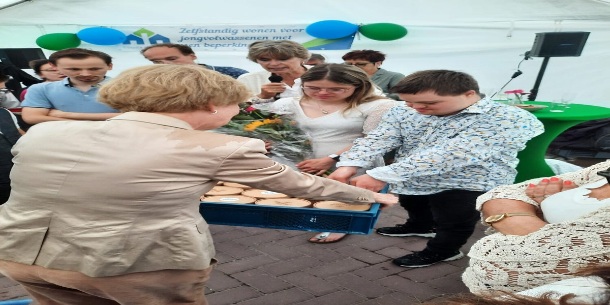 Ondanks de constante regen werd samen met wethouder Anna van Popering-Kalkman het lint doorgeknipt. De opening van het wooninitiatief was daarmee officieel. De bewoners wonen al ruim een half jaar in hun appartement, maar het was even wachten op een goed moment. Na het doorknippen van het lint en het poseren voor een staatsieportret was het tijd voor een feestje met alle genodigden.
